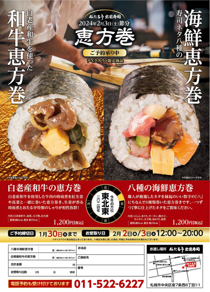 おたる亭の寿司職人が作り上げる、和牛と海鮮2種の恵方巻ができました!
